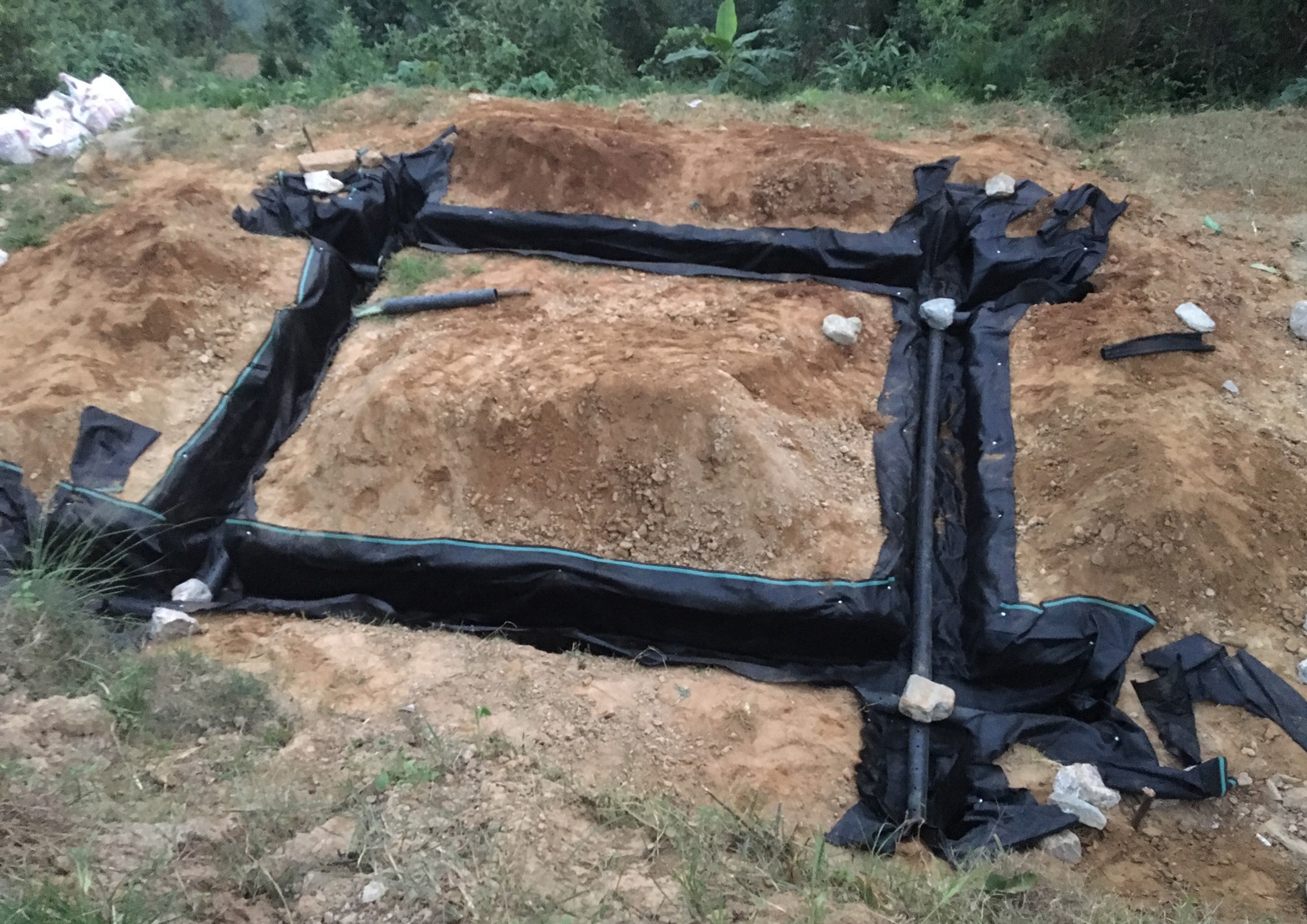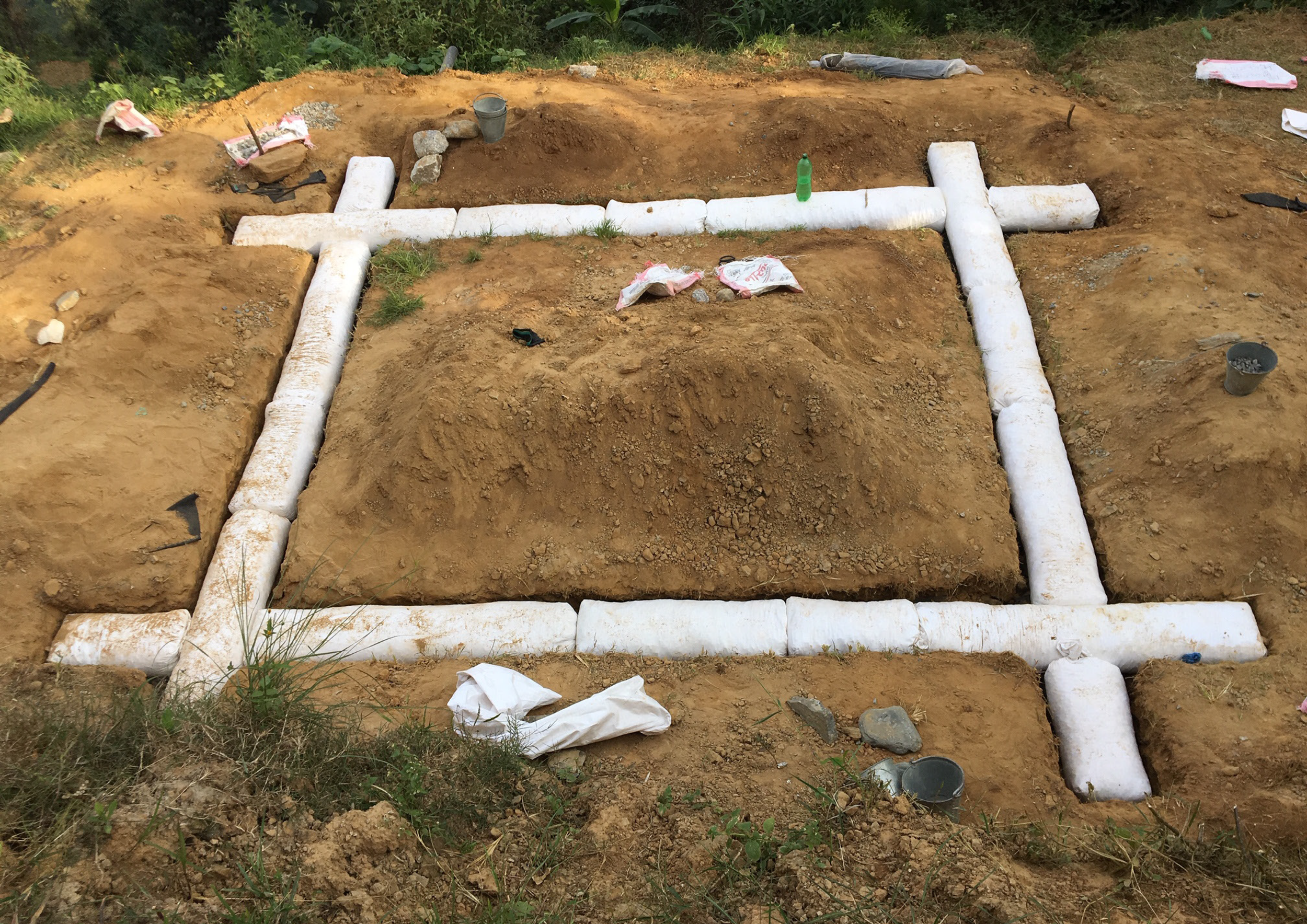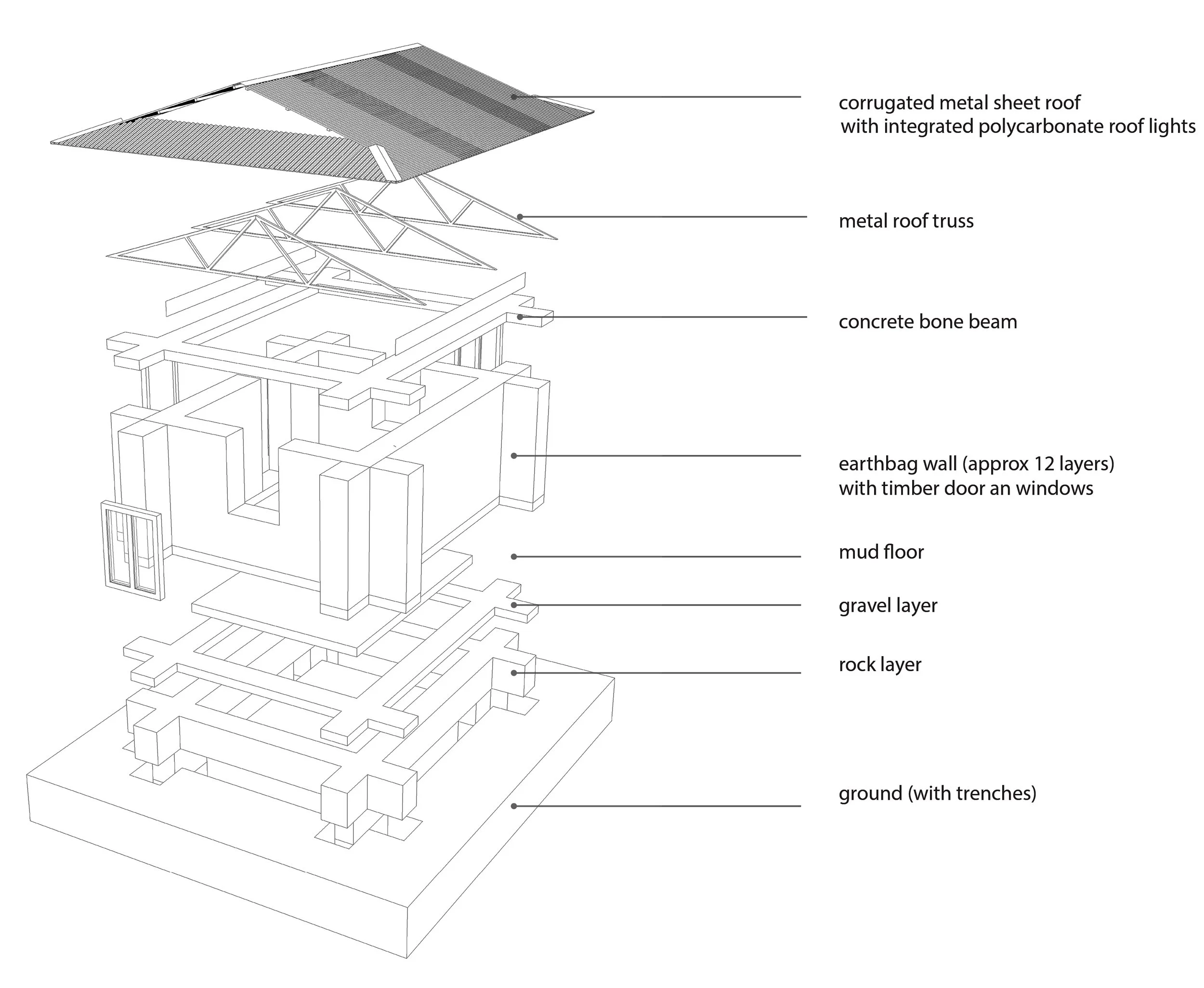 The Earthbag technology is rudimentary but effective. Essentially floating on gravel/boulder foundations allowing it to move with the earthquake movement.